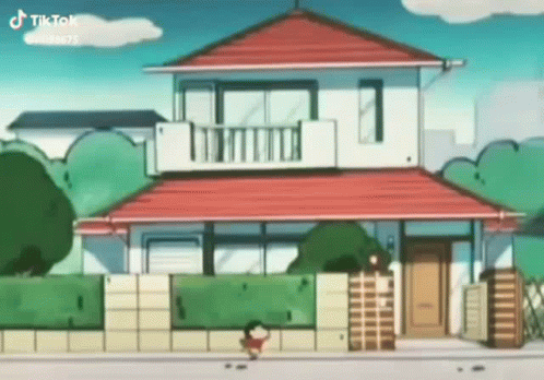 Shinchan performs a lively dance, possibly a "Balle Balle" style, outside his house.