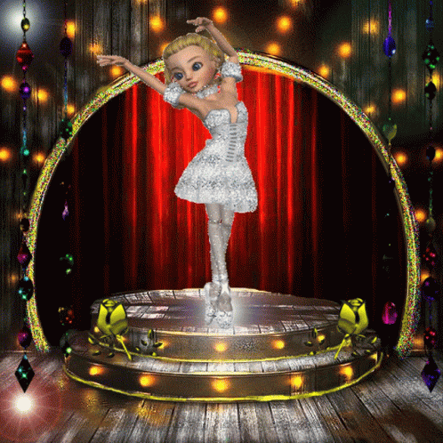Animated girl in a sparkling white dress performing ballet on a stage with a red curtain background.