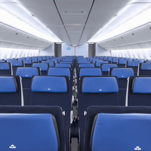 A KLM flight attendant celebrates 100 years of the airline inside a plane cabin with blue seats.