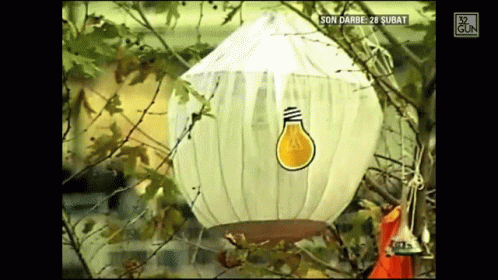 A white balloon lantern with a light bulb design hangs from a tree, with Turkish captions 'SON DARBE: 28 ŞUBAT'.