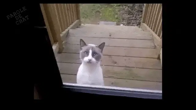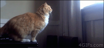 Balthazar the cat looks out a window, then attempts a jump but misjudges and falls out of frame.