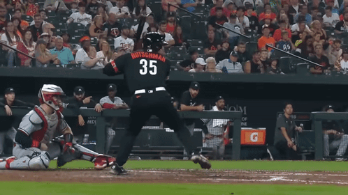 Baltimore Orioles catcher Adley Rutschman swings and makes contact with a baseball during a game.