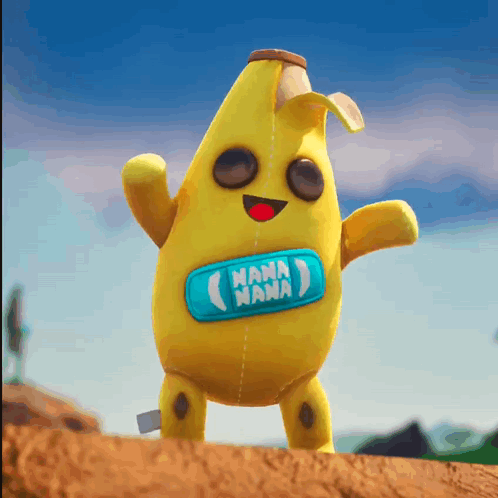 A cute, plush-like banana character from Fortnite, with 'NANA NANA' on its chest, performs a cheerful dance.