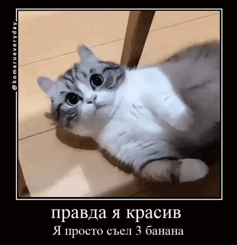 Komaru the cat looking cute after eating 3 bananas. Russian meme: 'truth I am beautiful, I just ate 3 bananas'.