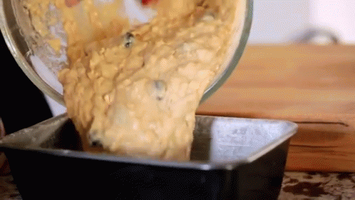 Pouring delicious banana oat bread batter, enriched with blueberries, into a loaf pan for baking.