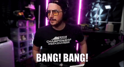 Jaredfps enthusiastically says 'Bang Bang' while wearing a Championship Weekend shirt and glasses.