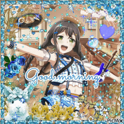 Tae Hanazono from Bang Dream in a sparkling 'Good morning' image with rabbits and blue accents.