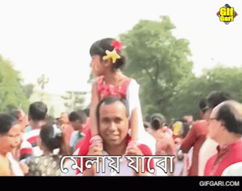 A man carries a little girl on his shoulders at a lively Pohela Boishakh fair in Bangladesh.
