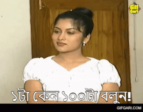 Woman in a white dress confidently says 'Why one, say a hundred!' in a Bangla Natok scene.