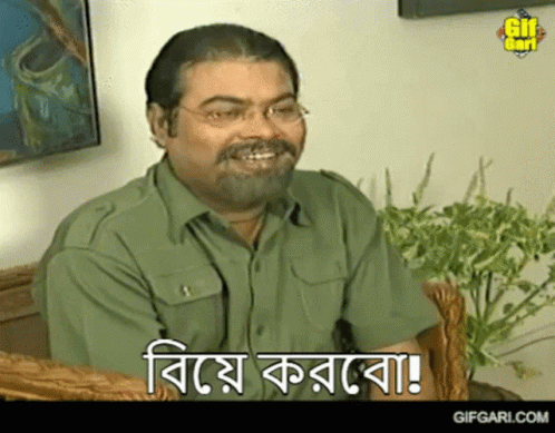 A man with glasses and a beard smiles and says 'I will marry!' (বিয়ে করবো!) in a scene from a Bangla Natok.