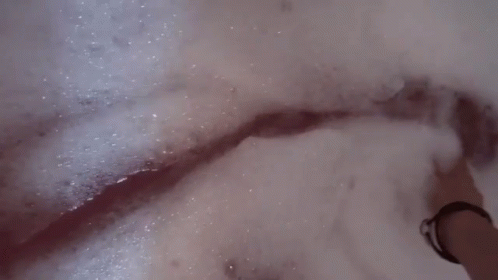 Sara Pecas enjoying a relaxing bath in a tub full of pink bubbles, gently moving her hand through the foam.