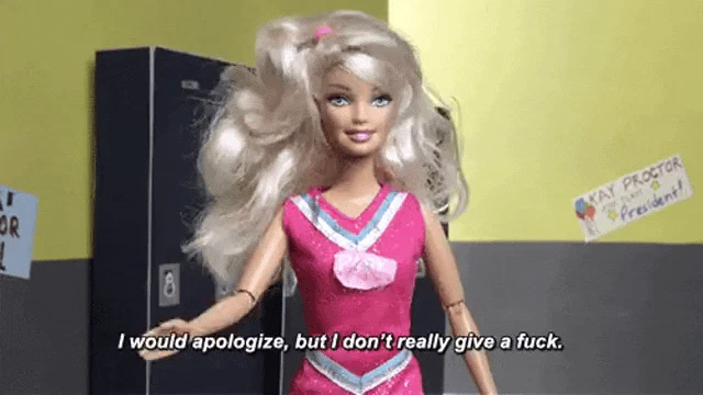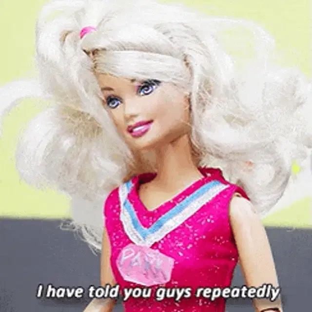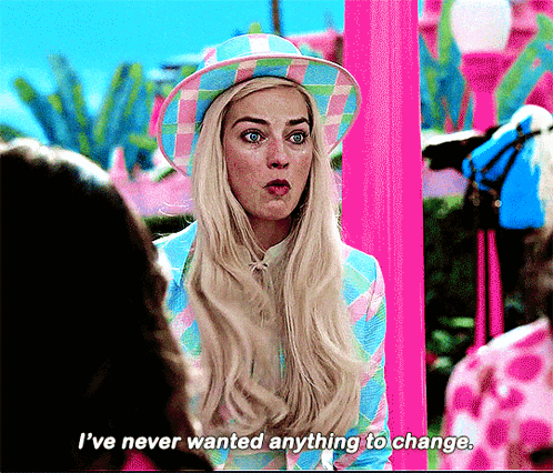 Margot Robbie as Barbie, distressed, exclaims "I've never wanted anything to change" in Barbie Land.