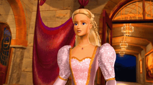 Barbie Rapunzel stands with her loyal dragon friend, Penelope, in a grand castle setting from the animated movie.