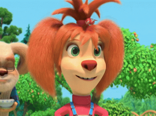 A red-haired character from "Барбоскины" has an idea, making a thoughtful gesture with a smile.