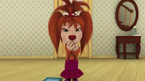 A Barboskiny character with red hair covers her mouth, looking shocked and surprised in a room.