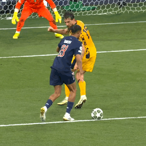 Bradley Barcola, wearing jersey number 29, misses an open goal opportunity during a crucial soccer match.
