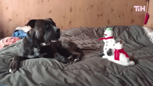 A Pitbull Terrier playfully barks and interacts with a stuffed snowman and another Christmas toy on a bed.