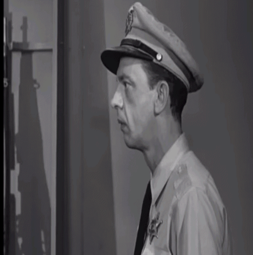 Barney Fife from The Andy Griffith Show looks around with a concerned expression in this classic scene.