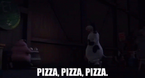Barnyard characters chant 'Pizza, Pizza, Pizza' in a dark room, expressing their love for pizza.
