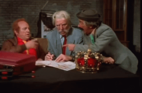 Baron Van Neemweggen, Vlugge Japie, and Bassie En Adriaan at a table with a crown, as Baron Van Neemweggen repeatedly exclaims 'Drommels!' in frustration.