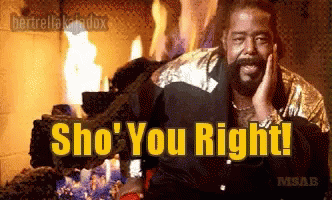 Barry White, the legendary singer, sitting by a warm fireplace with the iconic text 'Sho' You Right!' displayed.