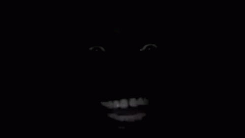 A creepy face with glowing eyes and a wide smile appears and disappears in the dark, creating a jump scare.