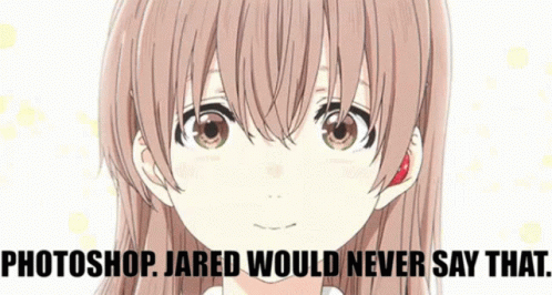 Anime girl reacts to a 'Photoshop. Jared would never say that' meme, featuring the character Based Jared.