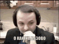 Zhmil in a suit and headphones, reacting with 'Oh, how based' in a kitchen setting.