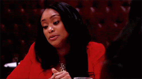A star from Basketball Wives, wearing a red top, eats at a restaurant, engaged in conversation.
