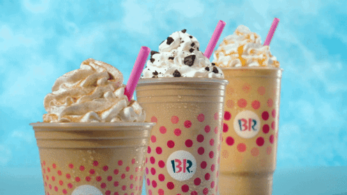 Three Baskin Robbins Cappuccino Blast drinks with whipped cream and various toppings.