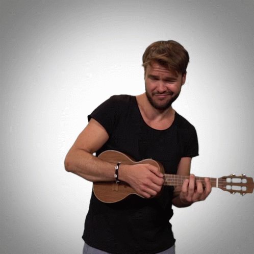 Basti M, also known as Basti Müller, plays the ukulele with expressive facial gestures.