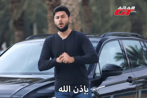 A man stands in front of a black car, with the ArabGT.com logo visible, speaking the phrase 'By the will of God'.