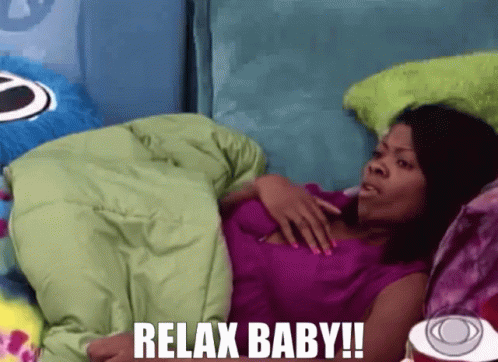 Libra Thompson relaxing on a couch under a green blanket, with the caption 'RELAX BABY!!' displayed.