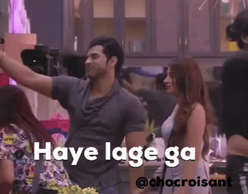 A man takes a selfie with a woman in a kitchen, featuring the caption 'Haye lage ga' from Bb13 Colors Tv.