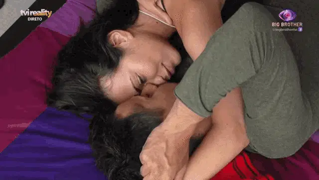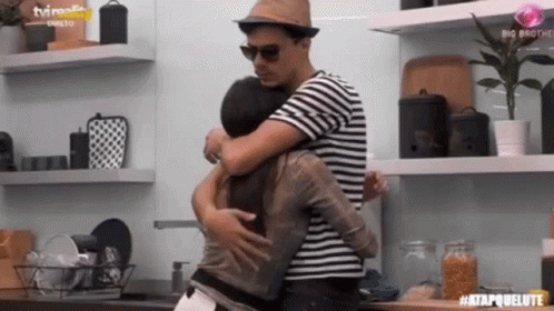Jessica and Pedro Alves (Jepe) share a warm hug in the kitchen during Big Brother 2020 TVI.