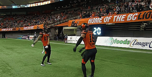 BC Lions football players celebrate on the field with a floss dance, cheered on by fans in the stadium.