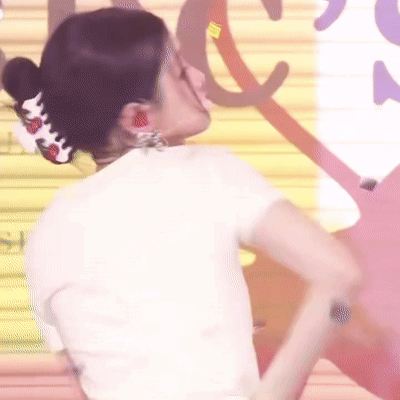 a woman wearing a white shirt and earrings is standing in front of a colorful background .