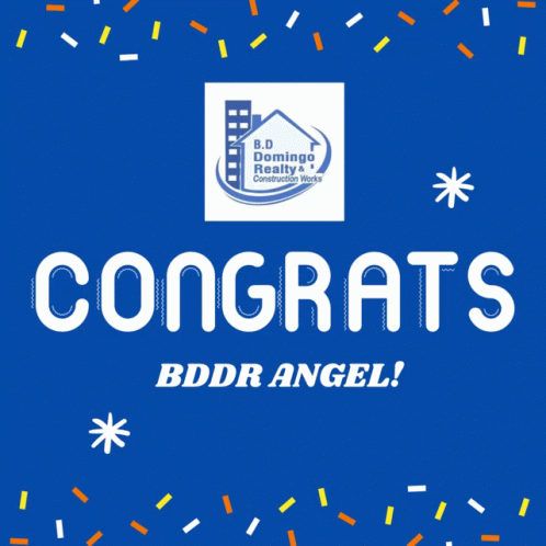 Animated graphic celebrating 'BDDR Angel' with confetti and the B.D Domingo Realty & Construction Works logo.