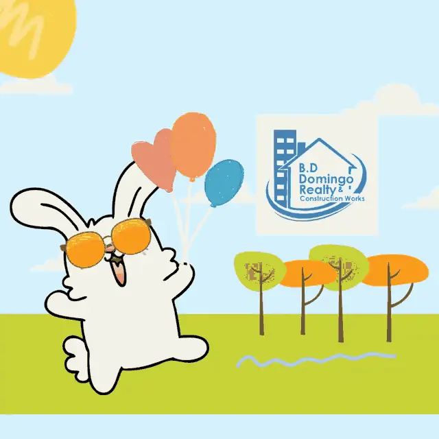 Cartoon girl winks next to a heart and "VERY NICE!" text, featuring B.D Domingo Realty & Construction Works.