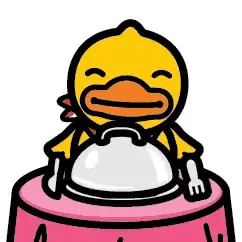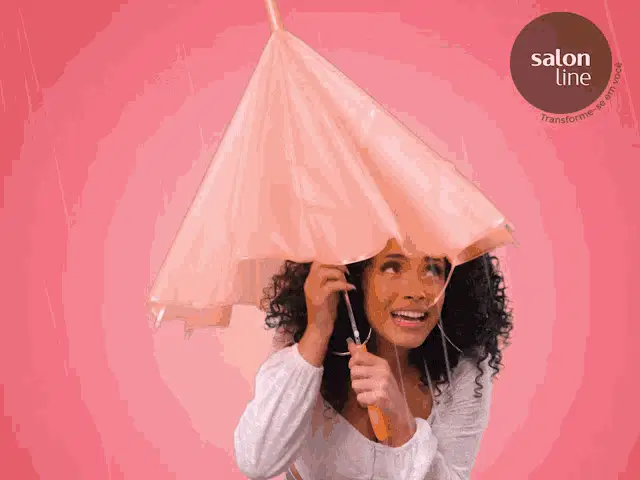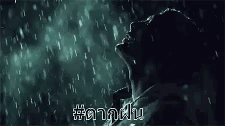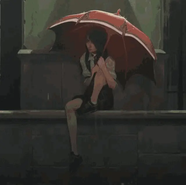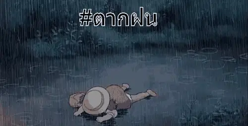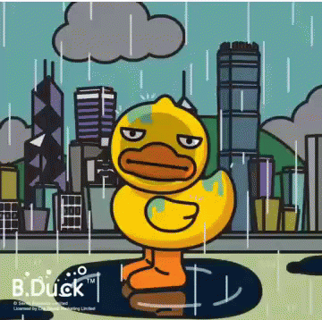 A cartoon B.Duck stands in a puddle in the rain with a grumpy expression, surrounded by city buildings.
