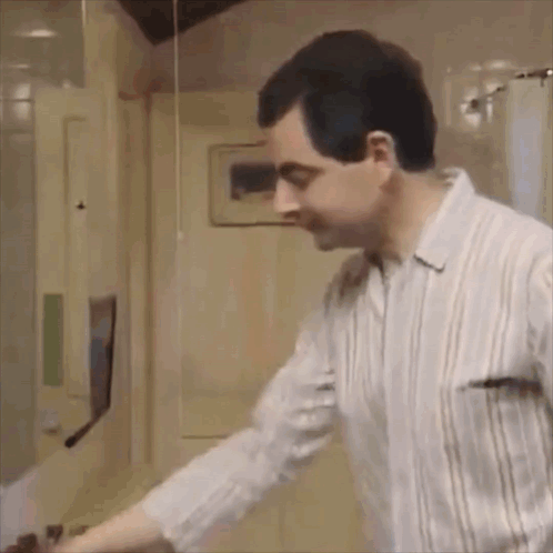 Mr. Bean comically attempts to brush his teeth using a pink toy water gun in a bathroom.