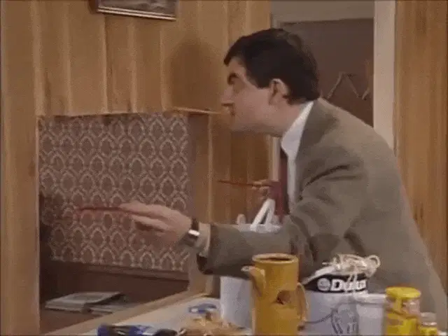 Mr. Bean, portrayed by Rowan Atkinson, waves with an 'SP' filter on his forehead.