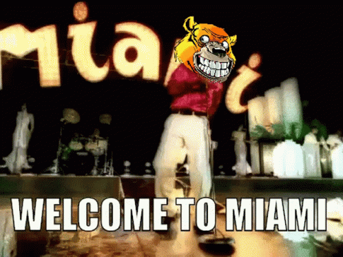 A person with a bear head dances in front of a 'Welcome to Miami' sign, creating a 'Bear Market' pun.