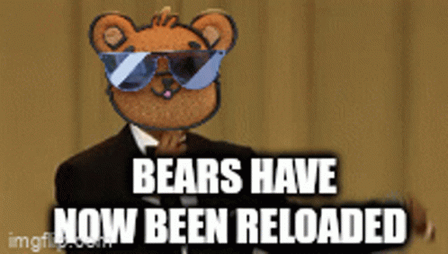 A bear character wearing sunglasses performs a mic drop, declaring 'Bears Have Now Been Reloaded'.