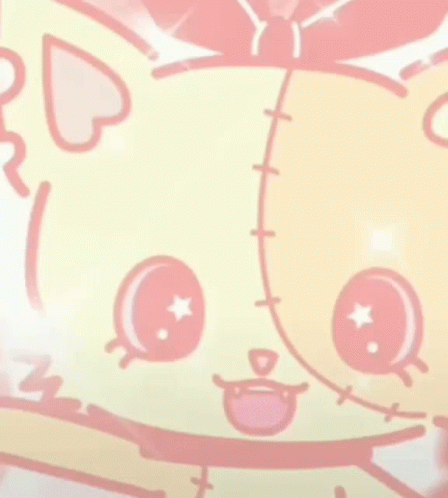 Close-up of the adorable Sanrio Beatcats character Rico, a pastel pink and yellow cat plushie with star eyes.