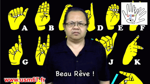 A man demonstrates 'Sweet Dream' in French Sign Language (LSF) with a sign language alphabet background.