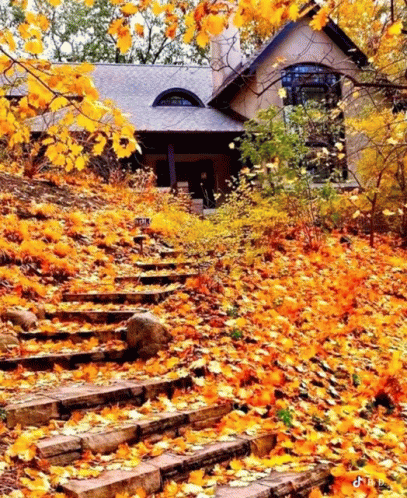 A beautiful autumn scene with a house on a hill, stone steps covered in colorful leaves, and a dog appearing.