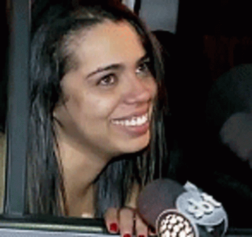 Stephany laughing and pointing from a car window, holding a microphone, in a lively moment in Curitiba.