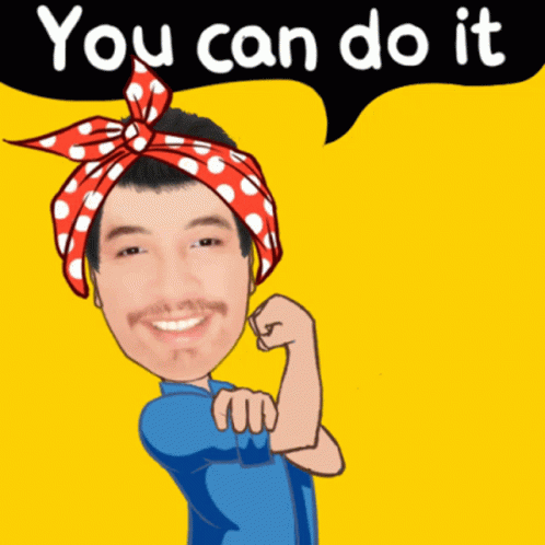 Cartoon man with a superimposed face in a Rosie the Riveter pose, encouraging with 'You can do it'.