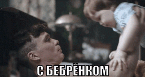 A man holds a baby, looking at each other, with the Russian meme text 'С БЕБРЁНКОМ' (With Bebryonok) overlaid.